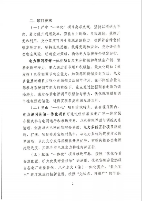 工作要求:積極開展方案論證。科學(xué)有序評估納規(guī)。落實項目核準(zhǔn)要求。統(tǒng)籌推動開工建設(shè)。細(xì)化并網(wǎng)運(yùn)行管理。優(yōu)先推進(jìn)鄉(xiāng)村振興項目。鼓勵重大創(chuàng)新示范。在上述工作要求中,《通知》要求,各省級能源主管部門應(yīng)開展“一體化”項目評估工作,與國家“十四五”可再生能源發(fā)展規(guī)劃充分銜接,逐項論證明確“一體化”項目立項條件、消納條件、建設(shè)規(guī)模、接入系統(tǒng)方案、配套電網(wǎng)工程等,在充分征求相關(guān)電力企業(yè)意見基礎(chǔ)上,于12月底前擇優(yōu)納入本省(區(qū)、市)電力規(guī)劃。