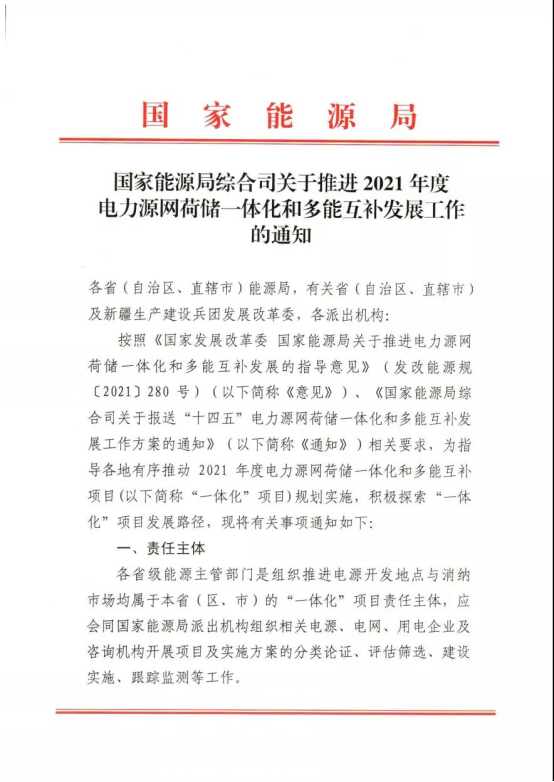 11月10日,國家能源局發(fā)布《關(guān)于推進(jìn)2021年度電力源網(wǎng)荷儲一體化和多能互補(bǔ)發(fā)展工作的通知》。