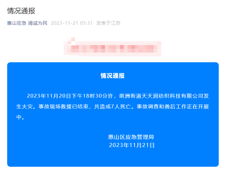 江蘇省無錫市一紡織廠11月20日晚間發生火災,事故造成7人死亡。據無錫市惠山區應急管理局發布的信息,惠山區前洲街道天天潤紡織科技有限公司11月20日18時30分許發生火災,事故共造成7人死亡。目前事故救援已經結束,善后工作已展開,事故原因正在調查中。另據惠山區委宣傳部提供的信息,事故中沒有發現其他受傷人員。